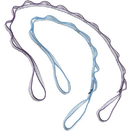 Mehrmals vernähte Rundschlinge. Sie bietet beim Klettern viele Optionen etwas daran einzuhängen. Vor allem beim technischen Klettern ist diese Rundschlinge unverzichtbar. Sie besteht aus 13 mm Dyneema-Bandmaterial mit vernähten Einzelschlaufen. Ein Karabiner darf nie an mehr als einer Schlaufe befestigt sein.