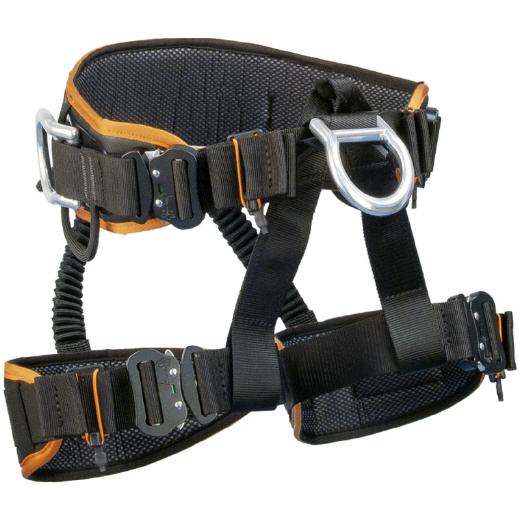 - eine separate Schlaufe für den D-Ring, der als Befestigungspunkt (EN 813) für die Verbindung absteigender Geräte dient.