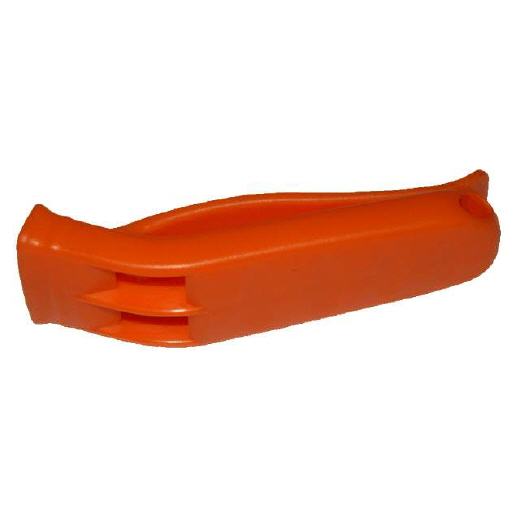 Signalpfeife aus extrem robustem Kunststoff mit Klipp zur Befestigung an Bändern und mit Öse für 3 mm Reepschnur.